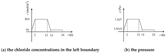 According to the fluctuation of the sea level in the tidal zone during 24 h, the variation of the chloride concentrations in the left boundary during a single cycle (24 h) was described using Equation (34), as shown in Figure 5a. The variation of the pressure was described using Equation (35), as shown in Figure 5b.