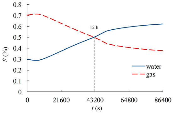 It can be observed that the chlorides were transmitted into the concrete within the first 12 h, thus increasing the solution saturation and decreasing the gas saturation. During the period between the 12th and the 24th hour, surface water evaporation led to a decrease in the solution saturation and an increase in the gas saturation.