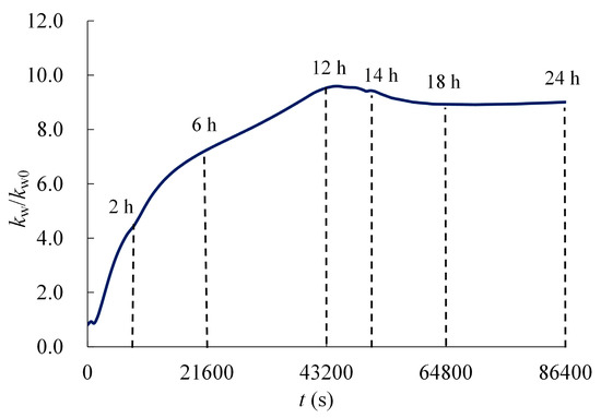 At t = 12 h, kw reached its maximum value, which was 10 times the value of kw0; at t = 24 h, the value of kw was 9 times that of kw0. Further, the curve can be divided into six segments. When t = 0–2 h, the solution permeability ratio, kw/kw0, grew at its most rapid rate, at 1.50/h. This suggests that the solution rapidly entered the concrete during this period. When t = 2–6 h, the rate of kw/kw0 growth decreased to 0.75/h. When t = 2–12 h, kw/kw0 continued to increase, but with a lower, stabilized rate of 0.33/h. When t = 12–14 h, kw/kw0 began to decrease slowly, indicating that the solution on the concrete surface had begun to evaporate. When t = 14–18 h, kw/kw0 continued to decrease, and eventually stabilized, such that kw/kw0 = 9.0 when t = 18 h. When t = 18–24 h, the solution permeability ratio, kw/kw0, was maintained at a steady value.