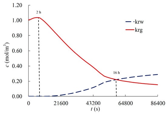 Figure 8 shows the variation of the relative permeability of the solution, krw, and the relative permeability of the gas phase, krg, at point A with time, t, during the first cycle.