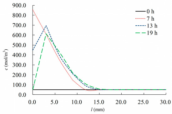 At t = 0 h, the initial concentration, c, was 50 mol/m3 at each of the points on the line. When t = 0–12 h, c decreased with an increase in l. When l reached a certain value, c reached its minimum value and remained steady. A peak value was not observed. When t = 12–24 h, c increased initially, and subsequently decreased with an increase in l. When l reached a certain value, the value of c reached a plateau. Therefore, there was a peak value of c. When the solution evaporated on the concrete surface, the chlorides dispersed and were transported internally and externally owing to the concentration gradients and capillary action. Consequently, a peak could be observed at a certain distance from the concrete surface.