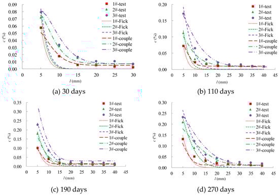 The results of the coupling model presented in this study were compared with the experimental data and fitted results of Fick’s Second Law, as shown in Figure 10. Figure 10a–d correspond to the results at 30, 110, 190, and 270 days, respectively. In the figure, ‘test’ corresponds to the experimental value, ‘Fick’ corresponds to the result obtained using Fick’s Second Law, and ‘couple’ corresponds to the results of the proposed model. The following conclusions were drawn from the analysis of the results.