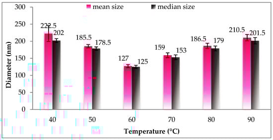 Figure 1 displays the different effects of temperature on particle size and size distribution of gac oil-loaded SLNs. Evidently, SLNs achieved the smallest mean size and were uniformly distributed in size at temperature of 60 °C. The declining size of the particles relative to temperature could be explained by the higher supply of energy to the system that both assisted the breaking down of droplet emulsion to smaller droplets and prevented particle aggregation. The size-declining range of 40–60 °C coincides with the melting temperature range of the Naterol SE (49–52 °C), causing the homogeneity of the emulsion, and, in turn, reduced particle size. However, as the temperature increased, small emulsion droplets were more likely to collide and coagulate, resulting in an increase in droplet size. Therefore, a hot homogenization temperature of 60 °C was used for further experiments.