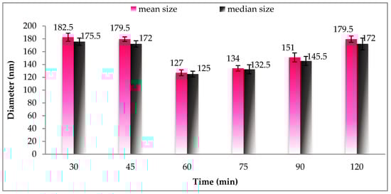 From 60 to 120 min, particle size increased from 126–176 nm, indicating that the excess energy supply tend to cause particles to collide, leading to increased size. Therefore, we select 60 min as the appropriate time for hot homogenization.