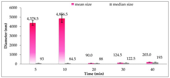 Figure 3 displays the effects of cold homogenization time on particle size and size distribution. At first glance, it is shown that the size of particles was large and strikingly heterogenous at 5 and 10 min, as demonstrated by the difference between mean size (4375.5 and 4856.5 nm) and median size (93 and 84.5 nm). The disuniformity of the particle size could be attributable to the insufficient energy required to break down the particles. From 20 to 40 min of cold homogenization time, the particle distribution was smaller and more uniform. The smallest particle size was achieved at 20 min of cold homogenization time, where the size increased thereafter with prolonged homogenization time. This trend could be explained by the solidification of SLNs at a low temperature, aggregating particles and therefore increasing particle size. Therefore, a cold homogenization time of 20 min was selected as the appropriate time for cold homogenization.