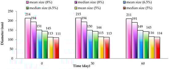 Figure 8 displays the particle size of SLNs corresponding to different gac oil concentrations in three storage periods including 0, 30 and 60 days. Overall particle size and distribution size of gac oil-loaded SLNs was relatively stable over time. After 60 days of storage, the 5%, 6.5% and 8% gac-oil sample only exhibited marginal size deviation, indicating that the sample had no phase separation or deposition. This result shows excellent size stability of SLN containing gac oil, which is promising for wider applications.
