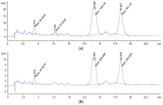 Based on the HPLC spectrum of Figure 9 performed at the wavelength of 450 nm, it is shown that the sample of gac oil exhibited four peaks with a total peak area of 2066.8958. In addition, peak location in the SLNs-gac oil spectrum is similar to that in the reference spectrum. Compared to the gac oil spectrum, the peak area in the SLNs-gac oil spectrum witnessed a substantial loss. This suggests that the process of encapsulation has resulted in the degradation of carotenoids. Based on Equation (1), the result of the stabilization of carotenoids in SLNs (%EE) after homogenization is about 44%.