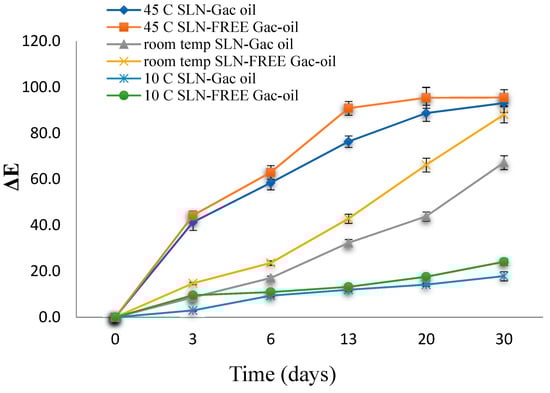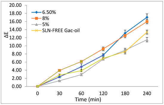 Figure 11 displays the trends of the color measure with regard to the UV exposure period. Accordingly, the UV exposure period had a significant effect on the color change of all the samples, which is demonstrated by the increasing ΔE trend. The gac oil-loaded SLNs experienced higher color change in comparison with other samples, indicating that SLN exhibited protective effects against oxidation degradation.