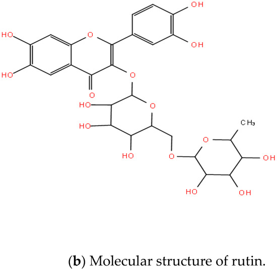 There are many factors that can influence the choice of solvent systems. The main factor is the molecular polarity of the compound to be separated. Flavonoids have a certain polarity, as they present as a series of compounds in which two benzene rings (A-ring and B-ring) having a phenolic hydroxyl group are linked by a central three-carbon atom, as shown in Figure 1a, and the basic mother nucleus is a 2-phenylchromanone. Figure 1b shows the molecular structure of a typical flavonoid rutin. The parent structure of rutin is a 2-phenylchromanone, which is a cross-conjugated system. The carbonyl group in this structure is conjugated to two benzene rings with a phenolic hydroxyl group. The ring is conjugated and becomes a strong electron-withdrawing group under the superposition of the electron-withdrawing induction effect and the electron-withdrawing conjugation effect. Relatively speaking, the polarity of the ether bond is weak, and there is a plurality of strong electron-donating hydroxyl groups in the molecule, but their distribution is divergent, and their effect is relatively weak. Therefore, the polarity in the molecule is mainly due to the action of the carbonyl group. The structure of the hydroxyl group also gives it a certain solubility in water.