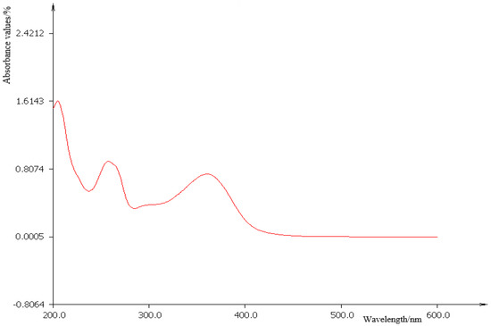Because flavonoids are a mixture, it is difficult to analyze them properly. As such, flavonoid monomers with the same parent nucleus structure must be selected for such experiments. Rutin has the same parent nucleus structure as flavonoids, as shown in Figure 1. When separating and purifying flavonoids from mulberry leaf extracts via HPLC, rutin is typically used as the standard. According to the different functional groups of different substances, the characteristic absorption peaks under UV irradiation were different. The rutin standard was scanned directly using a UV-visible spectrophotometer at full wavelength.