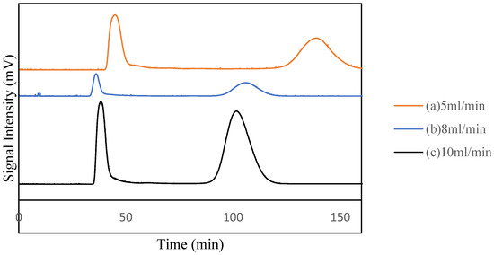 The results presented in Figure 4 and Table 3 indicate that the mobile phase flow rate had a substantial influence on the separation effect. As the flow rate of the mobile phase was decreased, the peak time of the corresponding flavonoid increased. The longer the separation time, the better the separation effect, and the higher the retention rate of the stationary phase [26]. When the mobile phase flow rate was 5 mL/min, the peak time of the flavonoid was 140 min, the retention of the stationary phase was 56.4%, and the purity of the product was as high as 93.8%.