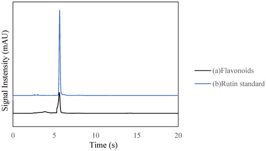 Under the same operating conditions, the chromatogram of the rutin standard and the chromatogram of the mulberry extract, as shown in Figure 3b and Figure 4b, were compared. The peak of the mulberry extract showed that the second peak contained flavonoids. Because the crude extracts of mulberry leaves are a mixture with two peaks, there is a certain delay in the peak time of the corresponding product peak.