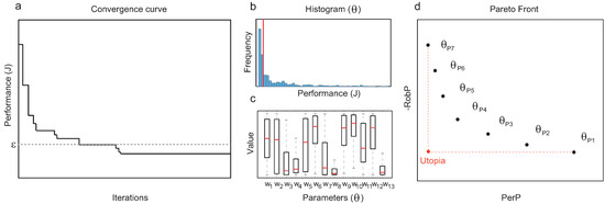 Figure 1. Details of the method. (a) Convergence curve of a single run of the optimization algorithm; solutions with performance values under the threshold are collected for further analysis. (b) Global performance of structure : frequency distribution of performance value J (median highlighted in red). (c) Robustness of topology : interquartile range (IQRs) for each of the active parameters. (d) Pareto front of topologies with optimal trade-off of global performance and robustness. - 6.