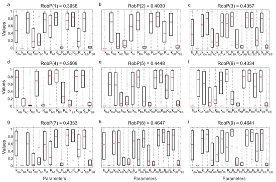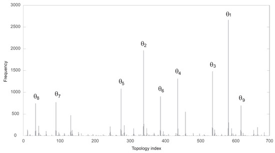 We evaluated the robustness of computing in Equation (10). In Figure 6, the interquartile ranges (IQR) of the parameters for each of the nine most frequent topologies and the corresponding are indicated.