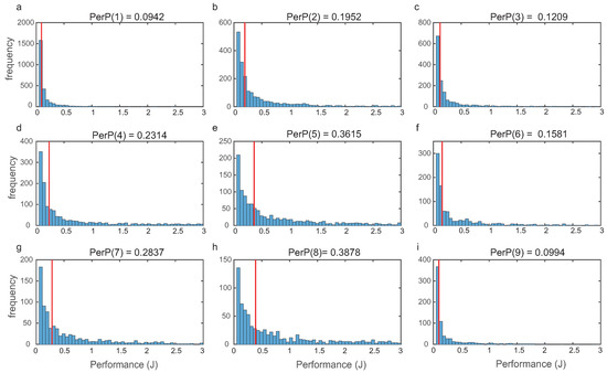 For each topology, we evaluated global performance computing (9) as indicated in Section 2. In Figure 5, we depict the histograms for the nine most frequent structures, showing that the distributions were right tailed.