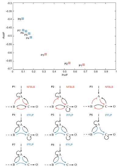Once each topology was characterized by its global performance () and robustness (), we pruned the Pareto optimal solutions among the set of functional topologies, i.e., the topologies that optimally trade-off and . In Figure 7, the Pareto optimal topologies – are shown in the objective space. , and topologies contain a NFBLB motif, whereas topologies – are of the IFFLP type.