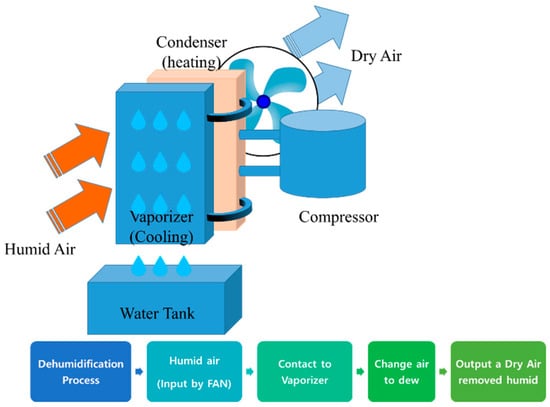 Humid air entering the interior by the fan contacts the surface of the cooler and condenses into water []. In general, a dehumidifier removes moisture in the air by this method and discharges the dehumidified air. Dried exhaust air is used to cool the temperature of the refrigerant used to drop the temperature of the cooler. As a result, the temperature of the output air is raised. Figure 1 shows the principle of the dehumidifier. Figure 2 also shows the structure of the thermoelectric element.