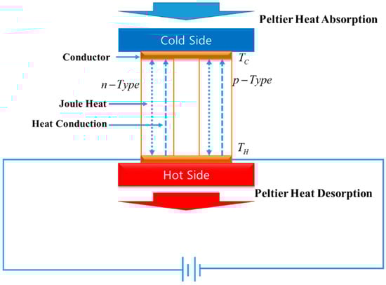 The first term is the influence of the Peltier effect, the second term is the influence of the Joule’s effect and the last term is the amount of thermal transfer by conduction from the high temperature side to the low temperature side in Equations (2)–(3).