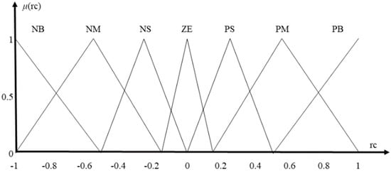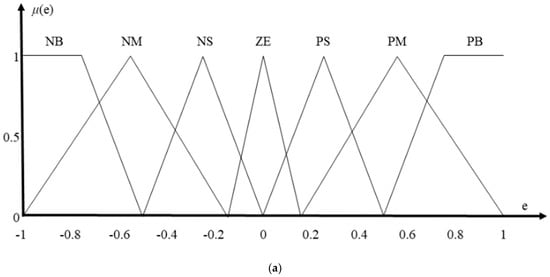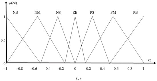 The membership functions in fuzzy control are formed using straight or curved lines. The triangular membership function and trapezoidal membership function in straight membership function are the most common methods. Due to their simple formulas and computational efficiency, these methods have been used widely. The performances of the membership functions have compared about vary control and the triangular and trapezoidal types can obtain benefits to real time control. The advantages of the triangular and trapezoidal types are proposed by many studies [,,,,]. Furthermore, since the triangular type has robustness in terms of the response speed and the error in steady-state, it has used extensively in the related region [,]. Therefore, the fuzzy control used in this paper has applied the triangular membership function.