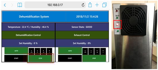 Raspberry pi and the Arduino were used in this paper for the implementation of the IoT, one element of Industry 4.0. Raspberry pi builds the Apache HTTP server (Version: 2.2.22, Apache software Foundation, ASF, Forest Hill, MD, USA) and configures the database with MySQL (Version: 5.6.23, MySQL AB, Cupertino, CA, USA) to save the data needed for control. Arduino measures the temperature inside the dehumidifier, stores it in the database (DB), and controls the thermoelectric elements inside the dehumidifier.