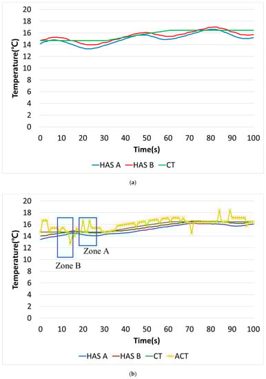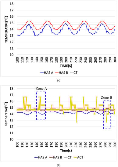 In Figure 14b, Zone A shows a lower temperature of the heat absorption side (HAS) of the thermoelectric element than the control temperature (CT) and Zone B shows a higher HAS temperature than CT. In Zone A, because it requires a rise in the HAS temperature, the temperature adjusted by the fuzzy control (ACT) rises. In Zone B, the ACT is going down for decreasing HAS temperature.