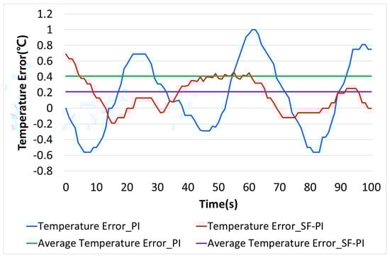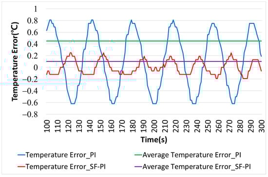Figure 19 shows a temperature error of the PI and the SF-PI controller under Figure 17 condition. The SF-PI controller can also achieve accurate temperature control under conditions of changing temperature and relative humidity by adjusting PI’s input value by fuzzy control. Table 10 shows the result of Figure 19. The temperature error of the SF-PI controller is reduced by about 50% compared to the PI controller.