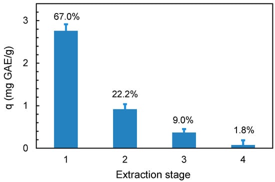 Amount of recovered phenolic compounds per unit weight of dry solid (q) in each extraction stage, with the associated recovery percentages.