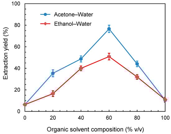 Regarding the influence of solvent type and composition on the extraction yields, from Figure 2 it can be seen that aqueous mixtures containing 60% v/v organic solvent were the most effective. Of the two organic solvents, acetone provided a higher recovery of phenolic compounds over the entire solvent composition range. Similar results were obtained in other studies on BSG [,] or different plant materials, such as spent coffee grounds [], artichoke waste [], mango by-products [] and beetroot [].