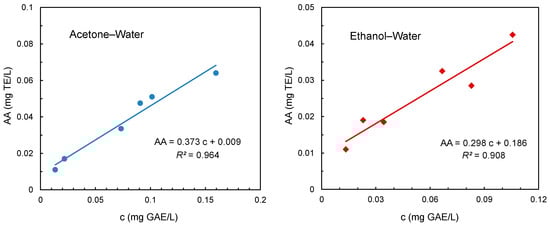 For both solvent systems, a sharp linear dependence (R2 > 0.9) was observed when the antioxidant activity of the extracts was plotted against the concentration of phenolic compounds (Figure 3).