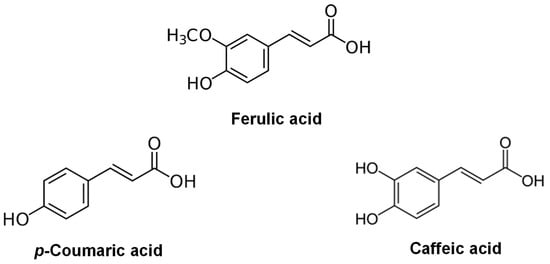 HSPs were used to estimate the affinity of phenolic compounds for the investigated solvents. Three of the major phenolics present in BSG, that is, ferulic, caffeic and p-coumaric acids, were selected as representatives of the whole class of phenolic compounds in this material (Figure 4). Their partial solubility parameters (δD, δP, δH) were calculated from Equations (A5)–(A7) using the group contribution values reported in []. Then, the total solubility parameter (δT) was determined from Equation (2). The molar volumes were estimated by the group contribution method of Fedors []. The results are presented in Table 2.