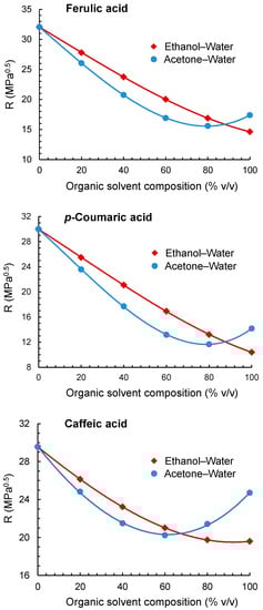 Finally, the solubility parameter distance (R) for the three phenolic compounds in the acetone–water and ethanol–water mixtures was calculated using Equation (4), leading to the results displayed in Figure 5.