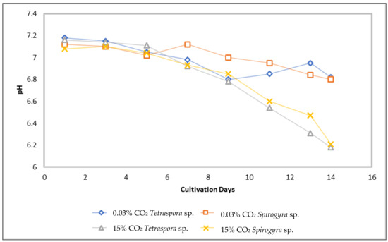 Futhermore, due to the CCM factor, the reduction of microalgae growth is closely related to the low consumption of nitrate ions. The aeration of 15% of CO2 leads to excess CO2 that is converted into H2CO3 and hence reduces the pH of the medium, consecutively influencing algae growth [27]. Figure 1 shows a decrease in pH values on days 12 to 14 due to the formation of carbonic acid (HCO3).