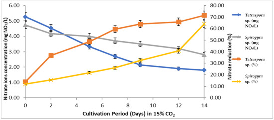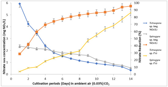 Figure 2 shows the concentration and reduction of nitrate ions for both microalgae species during the 14 day cultivation period. The initial nitrate ions concentration was 5.96 ± 0.28 mg/L and reduced to 0.37 ± 0.05 mg/L in Tetraspora sp. culture and 2.35 ± 0.19 mg/L reduced to 0.59 ± 0.08 mg/L in Spirogyra sp. culture aerated with 0.03% of CO2 (ambient air). The nitrate ions removal by Tetraspora sp. was better (95.33 ± 0.83%) than that by Spirogyra sp. (84.02 ± 2.16%) during the 14 day cultivation using Sungai Sura fresh water medium. The reduction of nitrate ions may be explained by the fact that both species consumed this inorganic substance as a macronutrient for growth and the photosynthesis process [6,22]. These results are consistent with the other research on the aqua cultural water ecosystem, that reported the application of the hybrid concept in removing nutrients and simultaneously cultivating microalgae species to produce biomass, which can be further exploited as live feed and a valuable biochemical resource of raw materials [23].