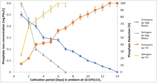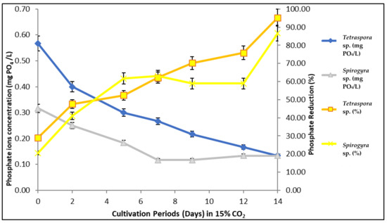 Figure 5. Phosphate ions (PO43−) concentration profile during the 14 days cultivation for Tetraspora sp. and Spirogyra sp. aerated with 15% of CO2.