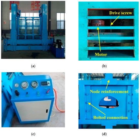 Model test system of water inrush in large buried depth and high water pressure tunnels. (a) Model test stand, (b) Driving mode of anti-force frame, (c) Hydraulic loading system, (d) Test box.