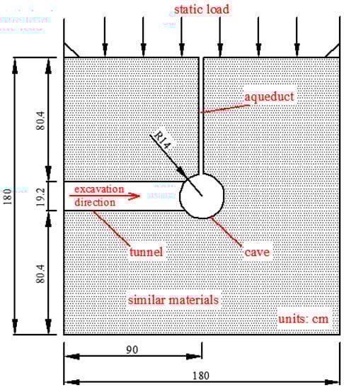 A geometric similarity ratio of 1:50 was chosen, and the tunnel section is a curved wall with three circular parts. The excavation width and height of the main tunnel are 14.50 m and 60 m, respectively, and that of the corresponding section of the model are 29 cm and 19.2 cm. The excavation location is located in the middle of the model body, which satisfies the boundary conditions. The filling height of the similar material is 180 cm, which is about 80 cm higher than the tunnel roof, and can simulate an actual buried depth of 40 m, and the average buried depth of the test section is 235 m. The remaining load is provided by the ground stress loading system, and the vertical stress is about 104 kPa. The method of pre-overload pressurization was adopted in the test. The stress state of the surrounding rock was formed over hundreds of millions of years, and it is difficult to simulate the model material through short-term loading. Therefore, the model confining pressure started with 2.5–3 times the design pressure loading, which accelerated the creep of the model material. After the model was stabilized, the pressure was lowered to the design confining pressure to start the test. A ball-type cave with a radius of 14 cm was preset in front of the tunnel, and the radius was about equal to the width of the excavation. The distance between the cave center and hole was 90 cm. The cave water pressure was 25 kPa, and the water pressure remained unchanged during the test. The model was excavated after the simulated stress and water pressure were stabilized. The design of the model test condition is shown in Figure 3.