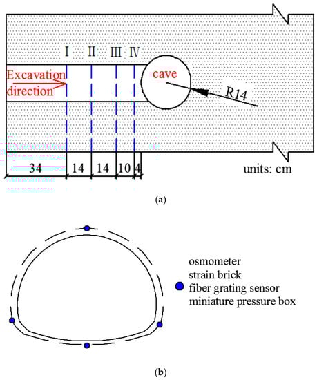 A manual drilling method was used for excavation, and the bench method was used for construction. The total length of the excavation was about 76 cm. The height of the upper bench was 11 cm, and that of the lower bench was 8.2 cm. Each cycle footage in the ordinary surrounding rock section was 4 cm (0–48 cm), and was 2 cm in the surrounding rock section affected by karst caves (48–76 cm). As the supporting principle, water inrush in front of the tunnel face during actual construction was not applied for the lining structure, and thus there was no support structure in this test, and only a simple support was made in the tunnel using gypsum. When the monitoring data were stable, the next cycle was repeated.