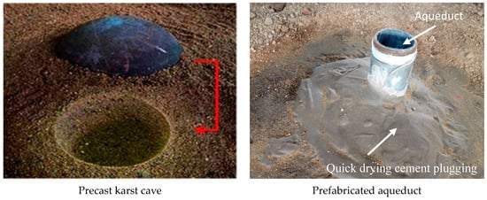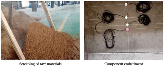 The concrete steps were as follows: the screening of raw materials, mixing of raw materials, filling of similar materials, laying of monitoring elements, presetting of the karst cave, and prefabrication of the water pipes, as shown in Figure 5.