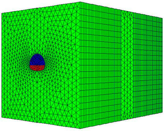 The cave model in front of the tunnel was established using the finite element software ANSYS (ANSYS Inc., Pittsburgh, PA, USA), and the model was then introduced into the finite difference software FLAC3D to calculate the excavation. Considering the actual working conditions, the boundary effect, and the location of the karst cave, the following model was established (Figure 6). In the model, a part of the karst cave was divided into a free mesh with an axial length of 12 m. The excavation part of the tunnel was mapped through mesh stretching, and the axes were stretched by 34 m in the front and rear directions, and the grid spacing was 1 m. The model size was 60 m × 80 m × 60 m, and the total number of units was about 13,000. The coordinate origin was located in the center of the cave, in which the horizontal direction was the x-axis, the tunnel axis was the y-axis, and the vertical direction was the z-axis. The tunnel span was 12 m, the cave diameter was 11 m, and the excavation distance was 34 m. The excavation method was the bench method. The footage of each excavation was 2 m in the first 22 m, and 1 m in the later 12 m. There were 23 excavation steps altogether. The boundary condition of the model was realized by applying the following displacement constraints: a horizontal direction displacement constraint to the left and right surfaces of the model, an axial displacement constraint to the before and rear surfaces, and a vertical direction displacement constraint to the lower surface. The upper surface was a free boundary, and the vertical load corresponding to the actual buried depth was applied. The seepage boundary of the six surfaces was a permeable boundary, and the pore water pressure was applied according to the actual pressure. The cave wall and the tunnel face were also provided with a permeable boundary, which corresponded to the model test. No support structure was provided during excavation.