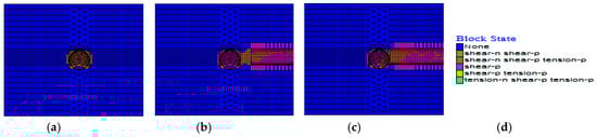 Plastic zone of the surrounding rock, (a) no excavation, (b) 18th excavation, (c) 23rd excavation, (d) Legend.
