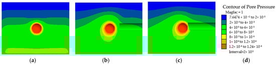 Contour of the pore water pressure. (a) No excavation, (b) 18th excavation, (c) 23rd excavation, (d) Legend.