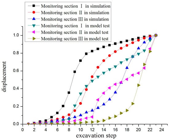 As shown in Figure 10, the results of the model test and the numerical simulation are consistent with the change in the vault displacement, which shows a continuous settlement. With the continuous advancement of the tunnel face, the vault successively produced an early settlement, an instantaneous settlement, and a late settlement, and the instantaneous settlement was at maximum, which indicates that the excavation disturbance has a significant influence on the stability of the surrounding rock. Compared with the monitoring sections I and II, the early settlement was produced in monitoring section III, which indicates that the existence of the water-bearing karst cave makes the tunnel surrounding rock more susceptible to buckling deformation, the difference being that the results of the model test increased a second time in the tunnel water inrush, with monitoring section III being the most obvious, and the final settlement being larger than monitoring sections I and II. It is inferred that this phenomenon was affected by the scouring of the karst cave gushing water, which indicates that the water inrush aggravated the late settlement rate of the surrounding rock.