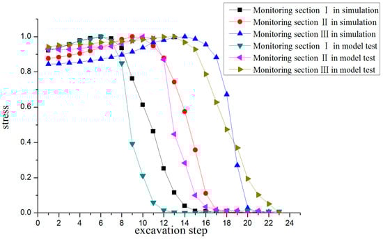 As shown in Figure 11, the results of the model test and numerical simulation are consistent with the change in vault stress, which showed a slow increase initially, and then a sharp decrease. The stress of the surrounding rock gradually increased during the initial stage of excavation, which exceeded the initial stress level, indicating that the stress concentration consistently led to damage and failure of the surrounding rock. When the excavation surface was excavated to the monitoring section, the stress value of the surrounding rock fell steeply owing to the excavation unloading action, which indicated that the damage and failure of the surrounding rock was aggravated. When the water inrush occurred, the stress of the surrounding rock was not obvious, which indicated that the water inrush no longer affected the stress of the stabilized surrounding rock. The maximum stress of monitoring section III was less than that of monitoring section II, which shows that the surrounding rock near the karst cave was weakened by the erosion of water, the strength of the rock mass was reduced, the accumulation of energy of the surrounding rock was decreased, and the stability of the rock mass was insufficient. There was also a risk of collapse after excavation.
