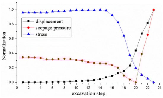 In the preceding analysis, the information of the different physical fields of the arch ring is basically consistent between the model test and the numerical simulation. The difference is that the displacement and seepage pressure of the karst cave were increased at different degrees in the model test, and the data from the numerical simulation showed no clear change. To determine whether karst water inrush was produced in the numerical simulation, the physical field information in the front of the karst cave was further analyzed, that is, the displacement, stress, and seepage pressure data of the tunnel axial unit were extracted. During the numerical simulation, the plastic zone of the surrounding rock started to transfix at the 18th step, and thus the extraction unit number is 81,161–81,165, and the node number is 33,221–33,225. In addition, to consider the variations in the test data synthetically, the linear function conversion method was used to map the physical information, such as the stress, displacement, and seepage pressure of monitoring section IV to a range of 0 to 1, and draw in the same coordinate system.