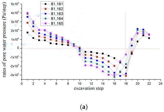The model test shows that the water yield suddenly increased when the water inrush occurred in the karst cave, and it is presumed that the flow velocity increased. The change in pore water pressure rate is the main basis of the fissure transfixing the water inrush during the numerical simulation. The pore water pressure rate is defined as v = pi + 1 − pi. It is shown in Figure 14 that the slope of the pore water pressure rate during the first through 18th steps is negative, and the slope can be considered an approximately fixed value. The pore water pressure showed a gradual change, which is the initiation and propagation process of water flowing fractures. The slope of the pore water pressure rate changed from positive to negative during the 19th through 23rd steps, the slope was abrupt, and the pore water pressure value increased sharply. In addition, the displacement and stress of the axial element were both mutated during the 19th step. Therefore, it was determined comprehensively that the water guiding channel was transfixed at the 19th step, and the distance between the excavation and karst cave is 4.5 m.