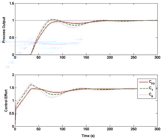 Comparison between the proposed fractional-order controller and other established controllers (the controllers with satisfactory performance). In the upper figure the process output for the proposed control strategies is shown while in the lower figure the control effort is presented. For the upper figure the same legend as for the lower figure applies.