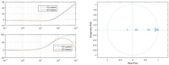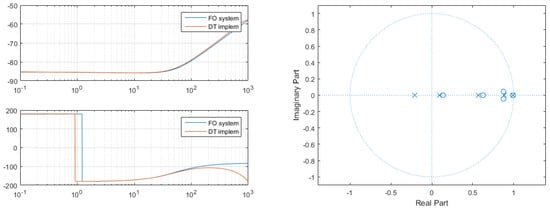 Left: Bode characteristics of the proposed FOC. Upper graph: Magnitude as a function of frequency (rad/s); Lower graph: Phase as a function of frequency (rad/s). Right: Pole zero map of the proposed FOC.