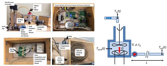 The process by which the new proposed controller will be implemented and tested in real-time has been described in [15] and controlled by nonlinear model predictive control to account for nonlinearities and variable time delays. The system is shown in Figure 4 together with its schematic representation. It consists of a heated tank in which the water level is controlled by a controllable valve, resulting in a constant water volume V. A submerged electrical heater delivers a constant heat flow Q which is used to warm up the water. By manipulating the flow , which is the outflow of the heated tank, the temperature in the vessel can be controlled. As the volume in the tank is constant, the same amount of water enters the tank from the cold tap. The outflow is created using a peristaltic pump (D2028, SparkFun Electronics, Boulder, Colorado) driven by a 24 DC motor. The relationship between the input voltage of the motor and the flow created by the pump is linear. At the outlet of the tank, a flexible tube of length L is attached, which introduces a variable transport delay into the system. Two PT100 sensors (B&B sensors, Donaueschingen, Germany) are used to measure both the inlet temperature and the outlet temperature at the end of the tube. A third temperature sensor (B&B sensors, Donaueschingen, Germany) is used to measure the tank temperature . A mixer ensures a homogeneous temperature in the water tank.