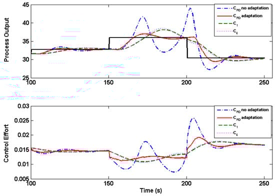 The proposed fractional-order controller was applied on a simulator of the real system in MATLAB/Simulink based on Figure 1. The results obtained from the simulation are depicted in Figure 2. It can be noticed that the proposed fractional-order controller () with adaptation has very good closed-loop performance (i.e., no overshoot).