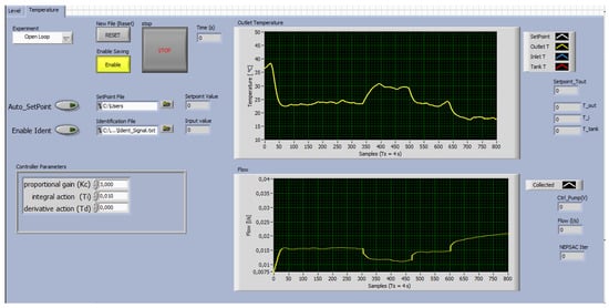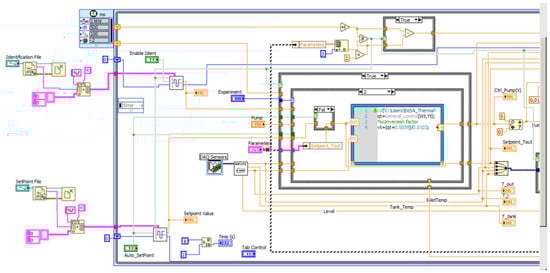 To implement of the designed controllers on the real plant, the Laboratory Virtual Instrumentation Engineering Workbench (LabVIEW) platform (National Instruments, 11500 N Mopac Expwy Austin, TX 78759-3504) was used. LabVIEW consists of Labview software (National Instruments, 11500 N Mopac Expwy Austin, TX 78759-3504, 2016), a data acquisition card (DAQ), and peripheral feedback equipment. LabVIEW uses data-flow programming, and the programs are known as Virtual Instruments (VIs). The VI has three components: block diagram, front panel, and icons/connectors. The front panel for the real-time experiment is shown in Figure 7 and the block diagram is shown in Figure 8. The front panel is the user interface which includes the control signal indications, the controller parameters, and wave chart of the set point, outlet temperature, inlet temperature, tank temperature, and flow.